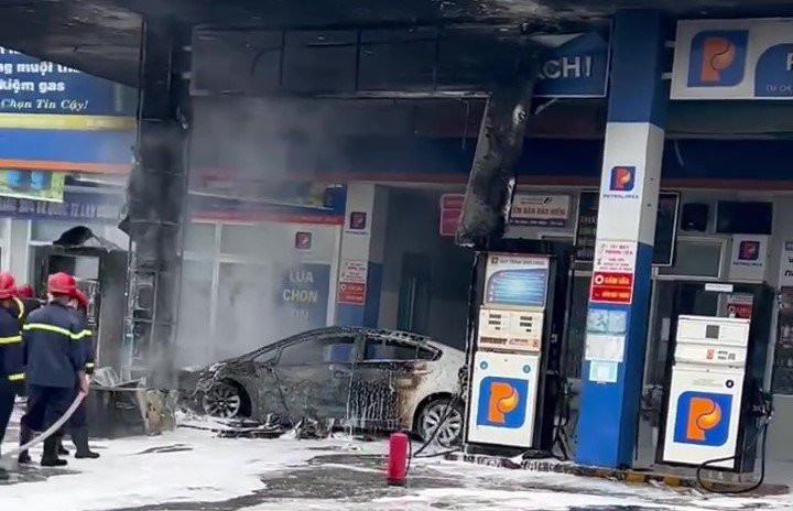 Cú va chạm mạnh khiến trụ bơm xăng đổ sập, đè lên một nhân viên cùng hai xe máy đang chờ tiếp nhiên liệu. Chỉ trong tích tắc, ngọn lửa bùng phát, bao trùm và bén sang hai chiếc xe máy. Nam nhân viên bị trụ đè trúng hoảng loạn vùng vẫy thoát thân, trong khi các đồng nghiệp lập tức lao vào dùng bình chữa cháy khống chế ngọn lửa.